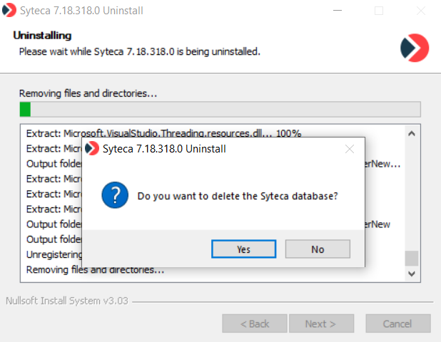 6. In the confirmation message pop-up window that opens, click Yes to delete the database, or click No if the current database will be needed later when installing Syteca Application Server again.