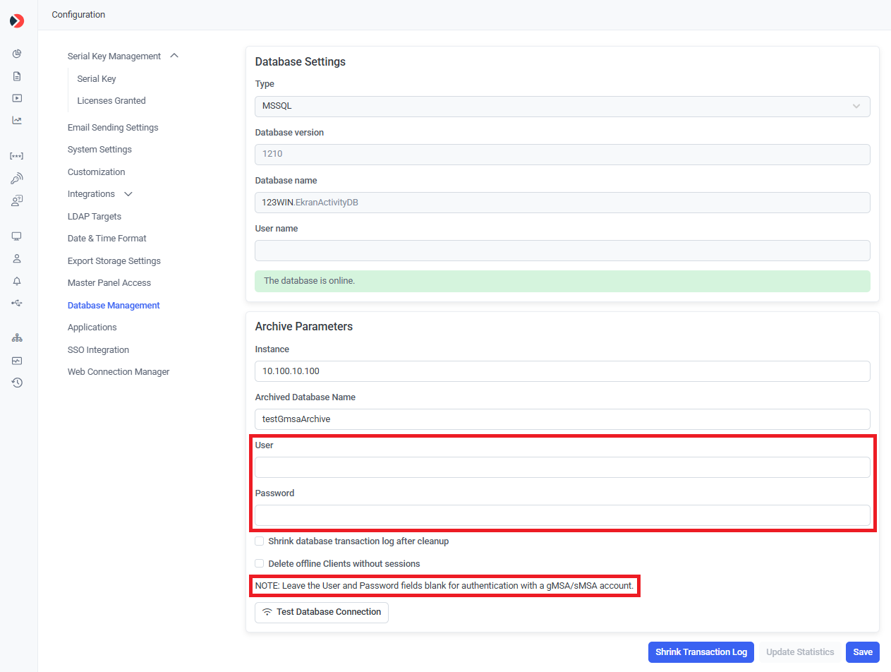 If required, a gMSA/sMSA account can be used for the connection between the MS SQL Server database and the Syteca Application Server (e.g. for security reasons).