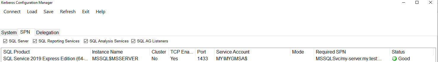 setspn -S MSSQLSvc/<SQLServerFQDN> <your_gMSA_login> For example: setspn -S MSSQLSvc/my-server.my.test:MSSERVER my\MyGmsa setspn -S MSSQLSvc/my-server.my.test:1433 my\MyGmsa |