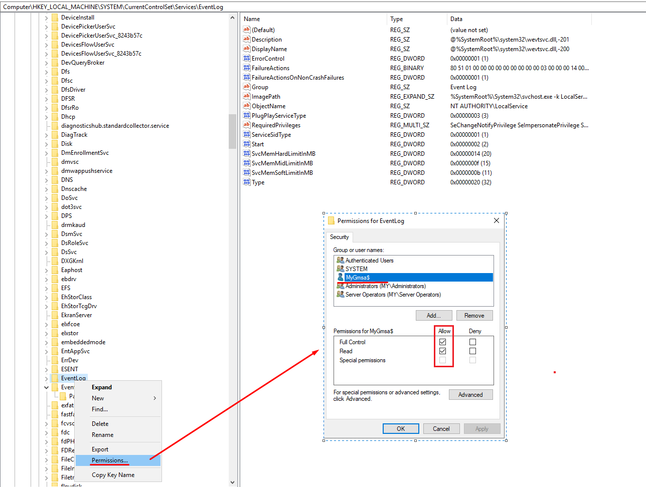 b) For the EkranServer service to be able to start, grant Full control permissions for the gMSA account to the Computer\HKEY_LOCAL_MACHINE\SYSTEM\CurrentControlSet\Services\EventLog folder.