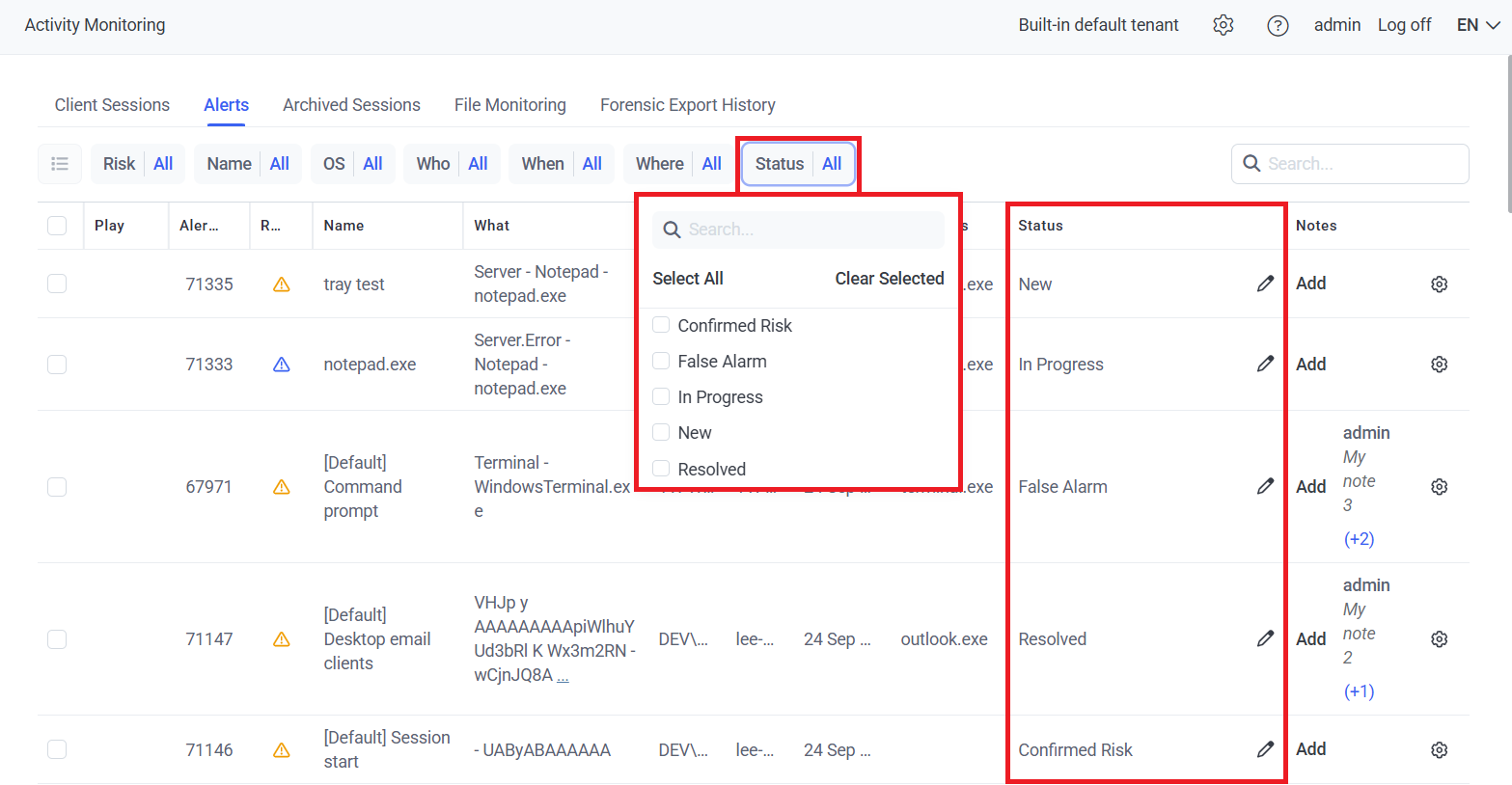 • Status: The status of an alert event (either Confirmed Risk / False Alarm / In Progress / New / Resolved, which can be changed by clicking the Edit (