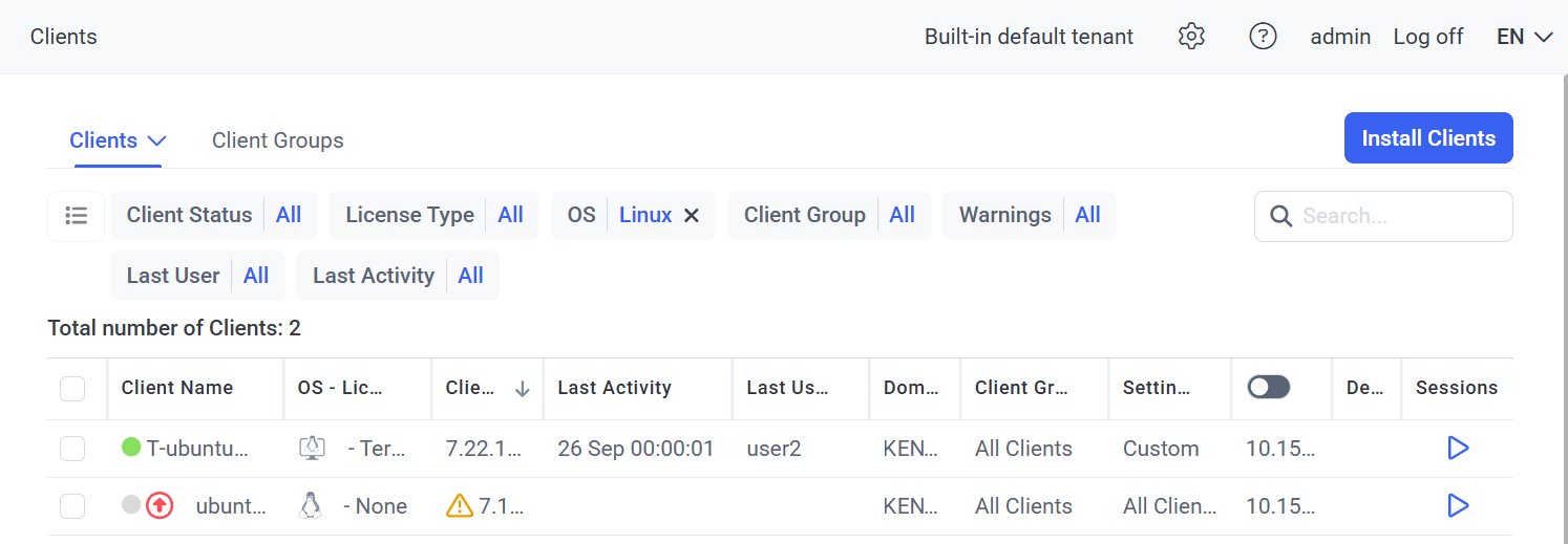 The Linux Clients are displayed in the Management Tool in the list of Clients displayed in the grid (along with any Windows and macOS Clients) on the Clients page.