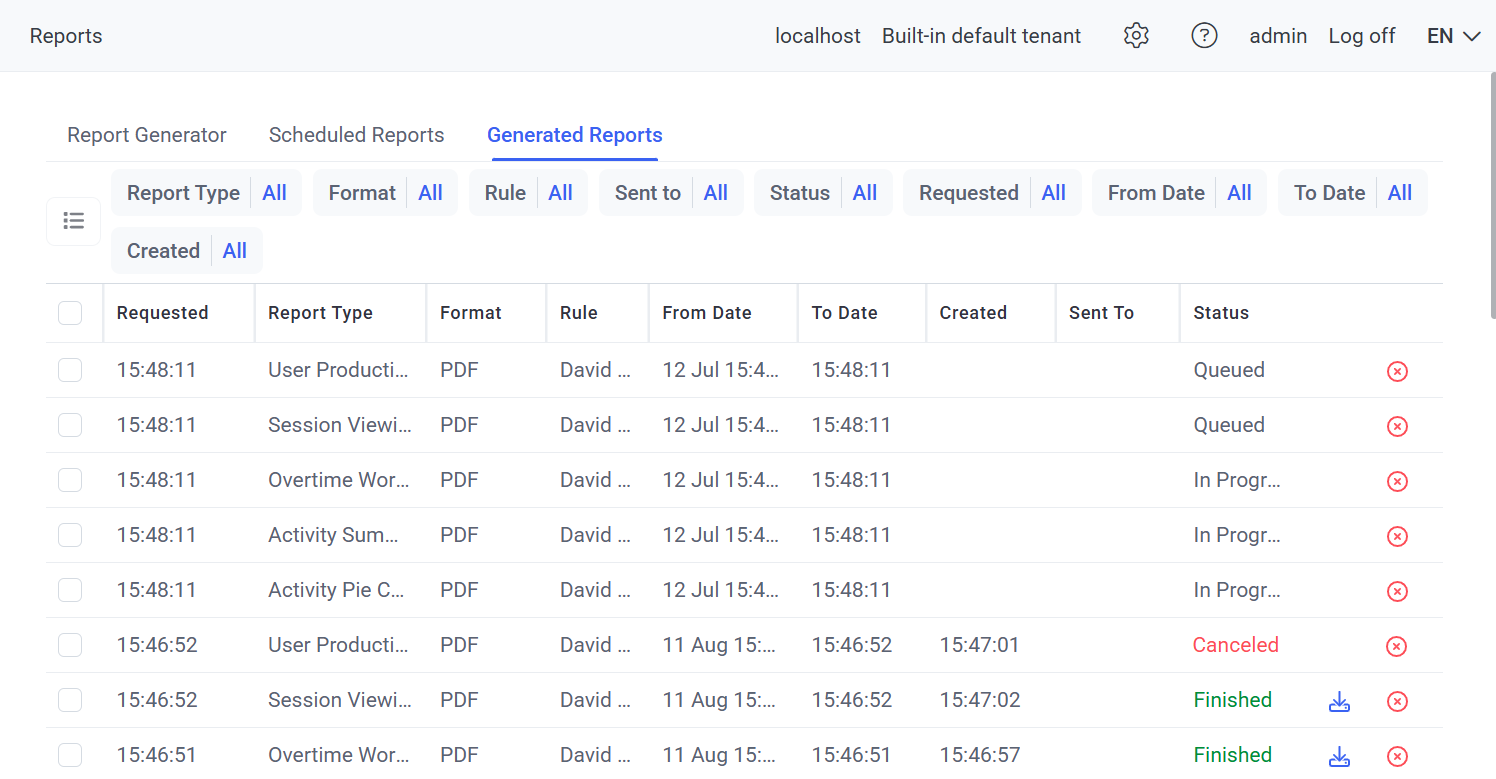 • Status: The current status of the report generation task [Queued / In Progress / Finished / Failed / Canceled].