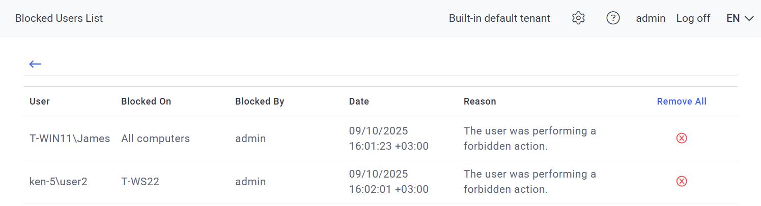 • Remove All: Allows a user to be unblocked by clicking the corresponding Remove () icon (or all users to be unblocked by clicking the Remove All button in the column header).