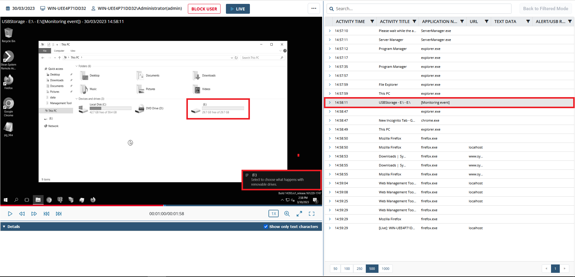 If USB monitoring rules have been added (and enabled), whenever a USB monitoring rule is triggered, the corresponding activity recorded when the USB device was plugged into the Client computer is also marked to indicate it in a similar way to alert events, by both: