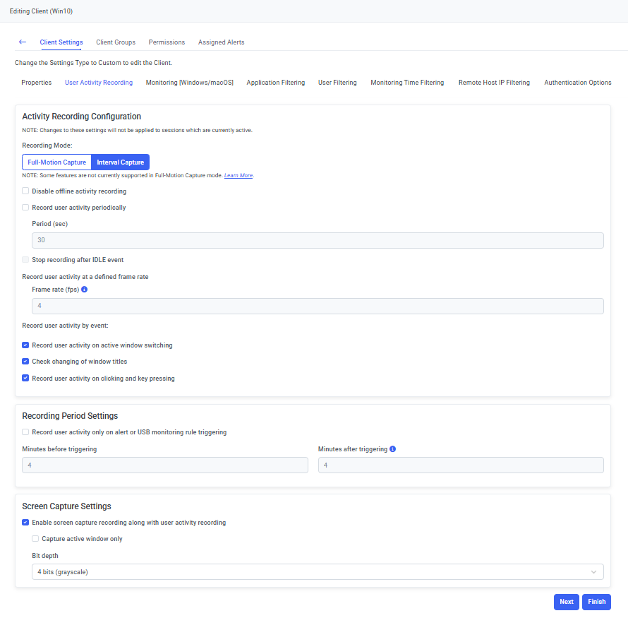 • User Activity Recording: No checkboxes are selected that may block the recording of user activities (e.g. the checkboxes selected in the default Client configuration can be used, as shown in the screenshot below). In particular, if the Record user activity only on alert or USB monitoring rule triggering checkbox (in the Recoding Period Settings section) is selected, the Client will only start recording sessions when an alert (or USB monitoring) rule is triggered.
