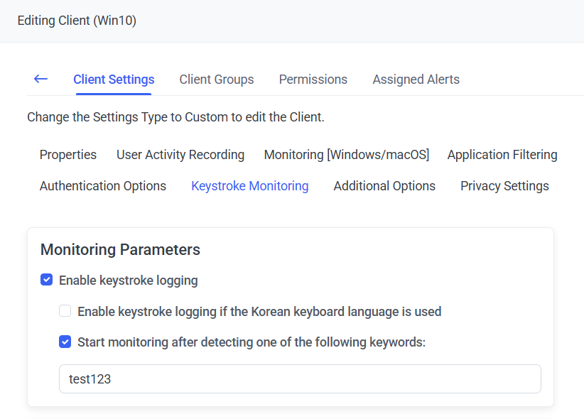 NOTE: In the screenshot above, a specific keystroke rule is shown that triggers recording of sessions only after the Syteca Client detects the keyword "test123" (and until the time when the session finishes).