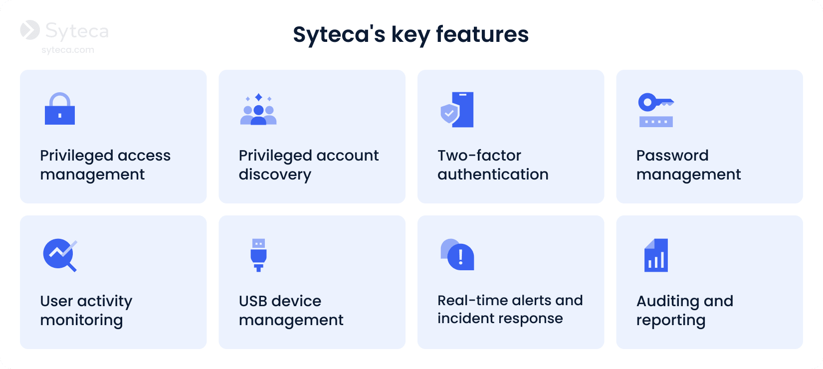 By deploying Syteca in your organization, you’ll get deep visibility into user activity and enhance your access management. With a robust set of features, Syteca can help you quickly detect and respond to identity threats and unauthorized access attempts.