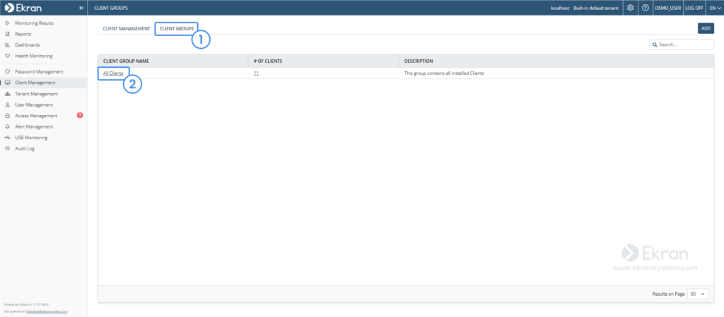 Suppose you want to disable monitoring for user activity in Word and Excel documents on all endpoints in your organization. Instead of configuring filtering parameters for each endpoint separately, you can open the Client Groups tab and choose the All Clients group.
