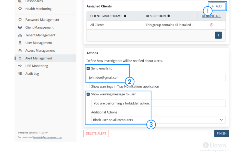 Afterward, you can configure Actions in the same way as in predefined Syteca alerts and click Finish to save the alert.