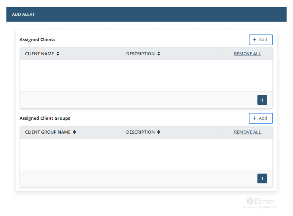 In the Assigned Clients and Assigned Client Groups sections, click Add to select the clients you want to apply the alert to.