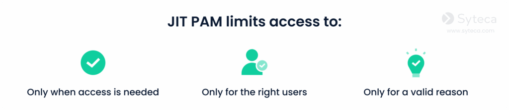 - With JIT PAM, users are granted only the access they need, for a limited time, and for a valid reason.