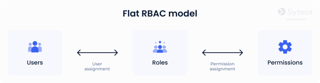 1. Flat RBAC is an implementation of the basic functionality of the RBAC model. All users and permissions are assigned to roles. Users obtain the permissions they need by acquiring these roles. There may be as many roles and permissions as the company needs. A single user can be assigned to multiple roles, and one role can be assigned to multiple users.