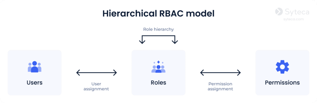 2. Hierarchical RBAC, as the name suggests, implements a hierarchy within the role structure. This hierarchy establishes the relationships between roles. Users with senior roles also acquire the permissions of all junior roles that are assigned to their subordinates. The complexity of the hierarchy is defined by the companyโs needs.