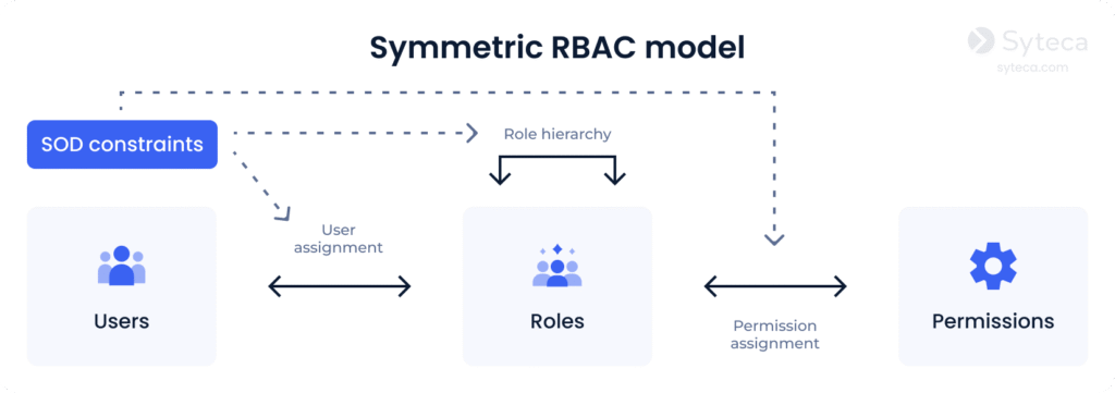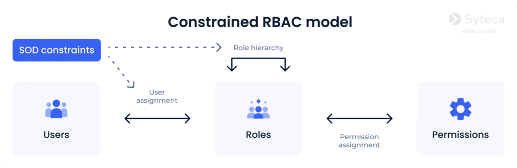 3. Constrained RBAC adds separation of duties (SOD) to a security system. SOD is a well-known security practice where a single duty is spread among several employees. Itโs quite important for medium-sized businesses and large enterprises. Separation of duties guarantees that no employee can introduce fraudulent changes to your system that no one else can audit and/or fix.