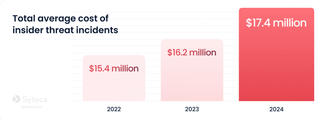 For these reasons, insider attacks precisely target the most sensitive assets and take a long time to contain, resulting in devastating losses for organizations. The total average cost of insider threat incidents rose from $15.4 million in 2022 to $17.4 million in 2024, according to the 2025 Cost of Insider Risks Global Report by the Ponemon Institute.