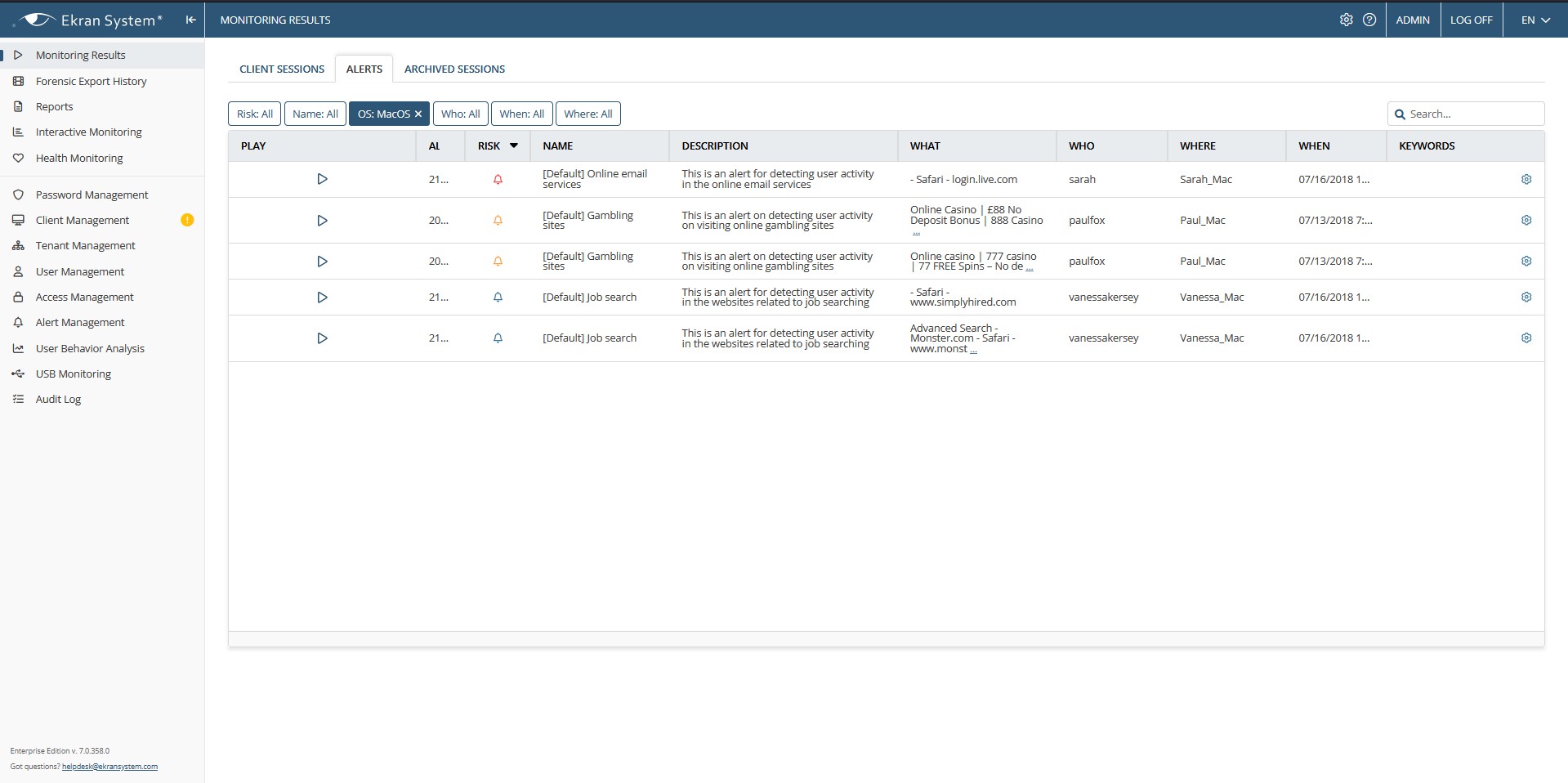 Syteca video + metadata Mac system monitoring format enables such a useful incident response tool as alerts on events.