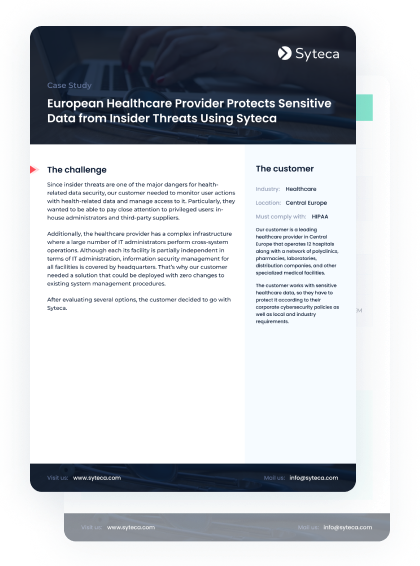 Our customer successfully enhanced the security of sensitive data with no changes in system management procedures. They implemented Syteca directly on critical endpoints, where it allows them to: