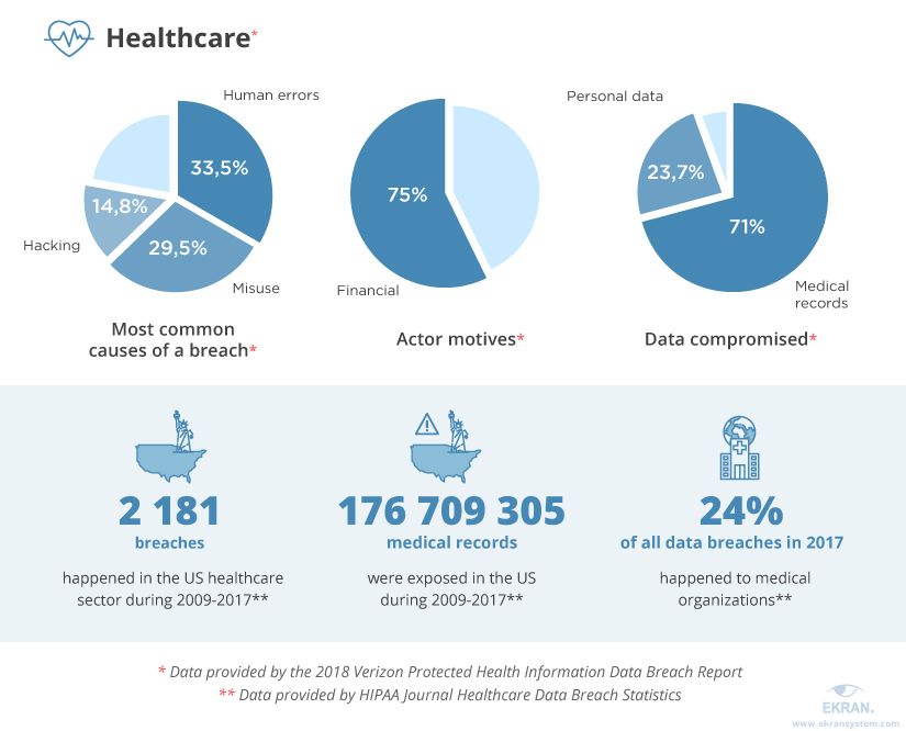 Według raportu Verizon 2018 Data Breach Investigations Report jedną z branż najbardziej podatnych na wyciek danych jest służba zdrowia. Co ciekawe, zdaniem specjalistów Verizon, większość incydentów związanych z wyciekiem danych w placówkach służby zdrowia pochodzi z wewnątrz danej organizacji, a nie – jakby się mogło wydawać – z zewnątrz. Drugą ciekawostką jest to, że ich najczęstszą przyczyną jest błąd ludzki. Do wycieku danych w placówkach ochrony zdrowia dochodzi więc nie na skutek ataków hakerskich, lecz w wyniku nieostrożności bądź niewiedzy samych pracowników.