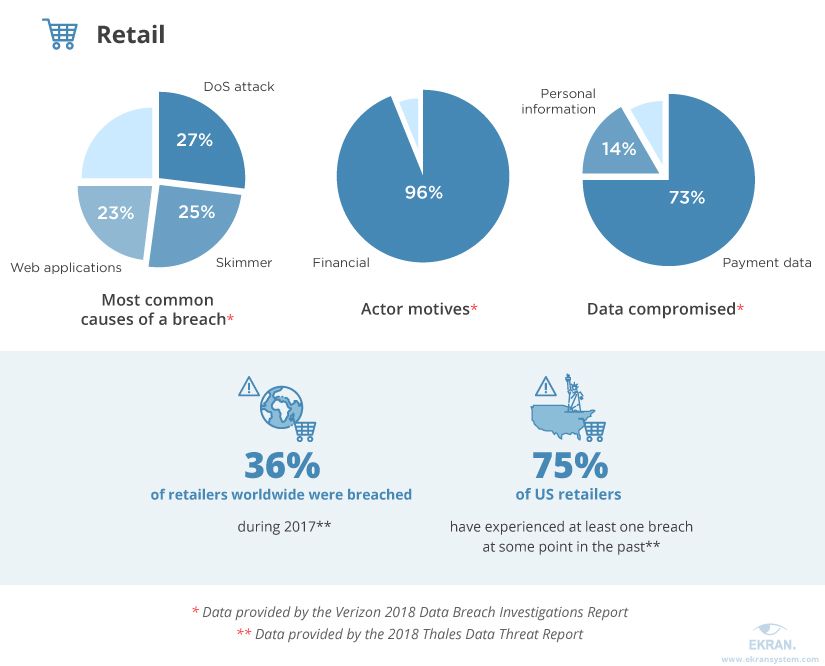 Jeśli o chodzi o cyberbezpieczeństwo twórcy raportu Verizon 2018 Data Breach Investigations Report porównują handel elektroniczny do branży hotelarskiej. Wskazują oni między innymi na niskie standardy bezpieczeństwa w sklepach internetowych i brak należytych zabezpieczeń przed wyciekami danych.